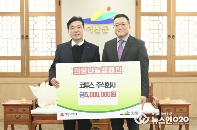 (뉴스인020 = 김성길 기자) 예산군은 예당호 모노레일 운영회사인 주식회사 코투스가 어려운 이웃을 돕기 위한 ‘희망 2026 나눔캠페인’에 동참해 성금 500만 원을 기탁했다고 2일 밝혔다.