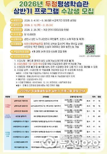(뉴스인020 = 김성길 기자) 천안시 두정평생학습관은 오는 12일부터 ‘2026년 상반기 평생학습 프로그램’ 수강생 535명을 선착순 모집한다고 2일 밝혔다.