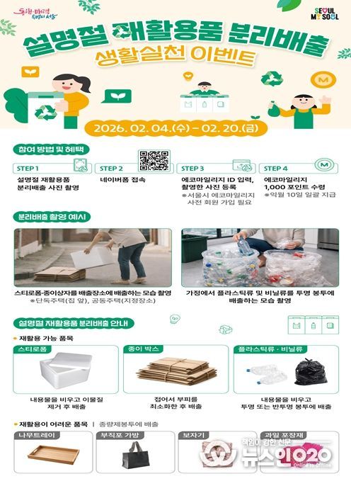 (뉴스인020 = 김성길 기자) 서울시는 설 명절을 맞아 명절 기간 중 급증하는 쓰레기를 줄이기 위해 재활용품 분리배출 캠페인과 설 선물 과대포장 집중단속을 함께 추진한다. 시민 참여형 이벤트와 유통업체 대상 점검을 동시에 진행해, 명절 쓰레기 감축과 자원순환 문화 확산을 도모한다는 계획이다.
