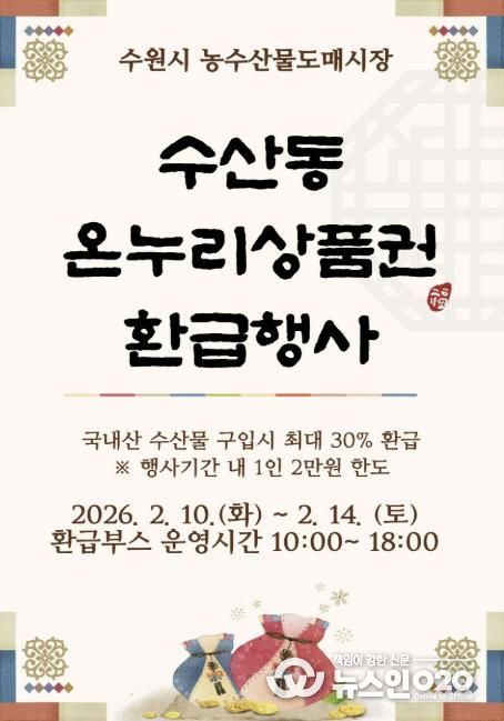 (뉴스인020 = 김성길 기자) 수원시농수산물도매시장 수산동이 설을 맞아 2월 10일부터 14일까지 온누리상품권 환급 행사를 연다.