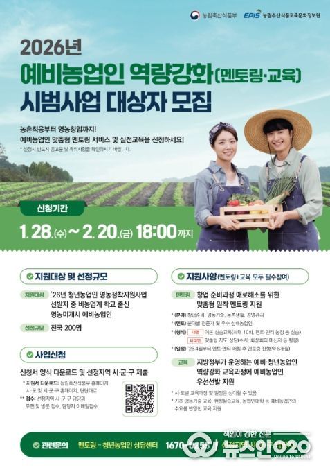 (뉴스인020 = 김성길 기자) 경상남도는 청년층의 농업 진입을 지원하기 위해 ‘예비농업인 역량강화 지원사업’을 2026년부터 신규 추진하고, 참여자를 모집한다고 밝혔다.