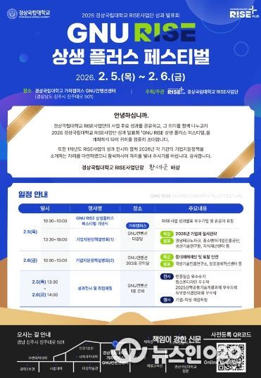 (뉴스인020 = 김성길 기자) 경상국립대학교 라이즈(RISE) 사업단(단장 황세운)은 2월 5~6일 가좌캠퍼스 GNU 컨벤션센터 대강당 일원에서 RISE사업의 1차 연도 성과발표회 및 기업지원정책 설명회 ‘GNU RISE 상생 플러스 페스티벌’을 개최한다.