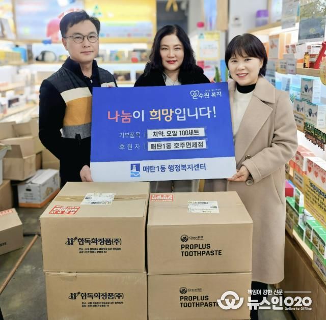 (뉴스인020 = 김성길 기자) 영통구 매탄1동 행정복지센터는 지난 3일 호주면세점직영할인점 매탄점이 설 명절을 맞이해 매탄1동 행정복지센터에 프로폴리스 치약 100개, 오일 관절크림 100개를 후원했다고 밝혔다.