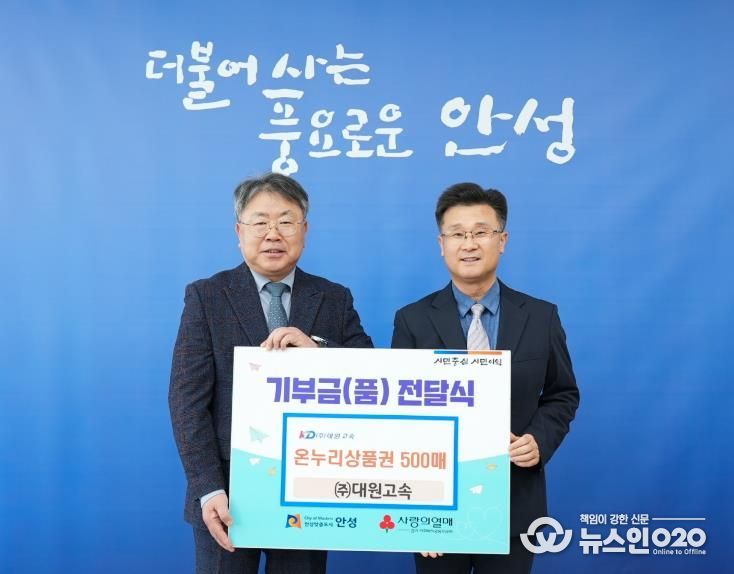 (뉴스인020 = 김성길 기자) 안성시는 2월 3일 대원고속으로부터 지역의 어려운 이웃을 돕기 위한 온누리상품권 500매(500만 원 상당)를 전달받았다고 밝혔다.
