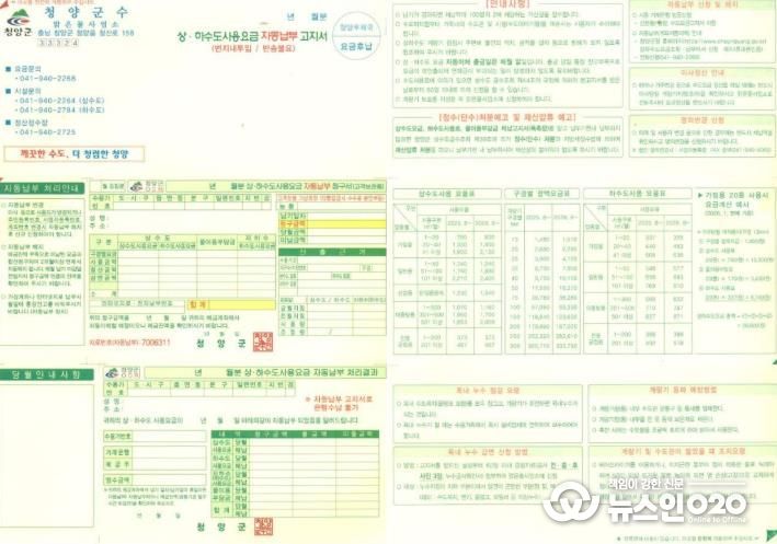 (뉴스인020 = 김성길 기자) 청양군이 군민의 소중한 개인정보를 보호하고 고지서 가독성을 높이기 위해 상·하수도 요금 고지서를 기존 지로형에서 ‘봉합형’으로 전면 개편한다.