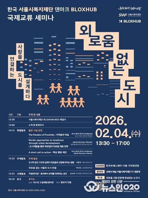 (뉴스인020 = 김성길 기자) 국내 최초로 외로움을 의제 삼아 정책을 추진하고 있는 서울시와 서울시복지재단이 덴마크의 블록스허브(BLOXHUB)와 ‘외로움’을 주제로 국제 교류 세미나를 열고 업무협약을 맺었다.