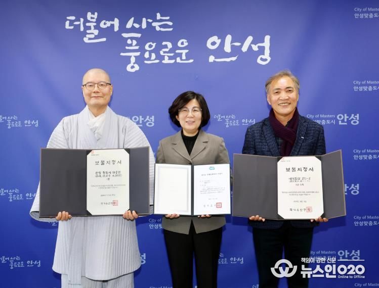 (뉴스인020 = 김성길 기자) 안성시는 2026년 2월 5일 오후 4시 30분 안성시청에서 '안성 청원사 대웅전'과'예기집설'의 ‘보물’ 지정 그리고 '경책신공문'의 ‘도유형문화유산’ 지정에 따른 증서를 소유자 및 소유단체에게 전달하는 수여식을 개최했다.