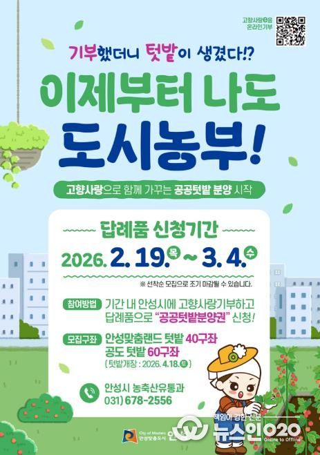 (뉴스인020 = 김성길 기자) 안성시는 오는 2월 19일부터 고향사랑기부제를 통해 도시농업을 체험하는 ‘도시농부’를 모집한다고 밝혔다.