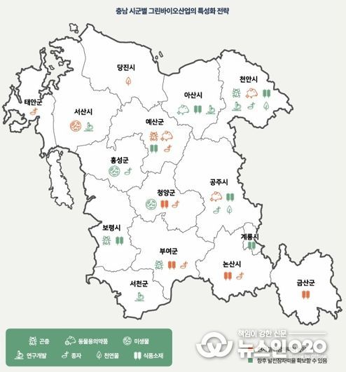특히 “▲곤충은 천안·예산·부여, ▲동물용의약품은 천안·예산·공주, ▲미생물은 서산·홍성·청양, ▲식품소재는 논산·금산·부여·청양, ▲연구개발은 천안·서천, ▲종자는 예산·부여·청양·논산, ▲천연물은 당진·예산 등에서 권역별 특성화 전략을 펼쳐야 할 것”이라고 말했다.