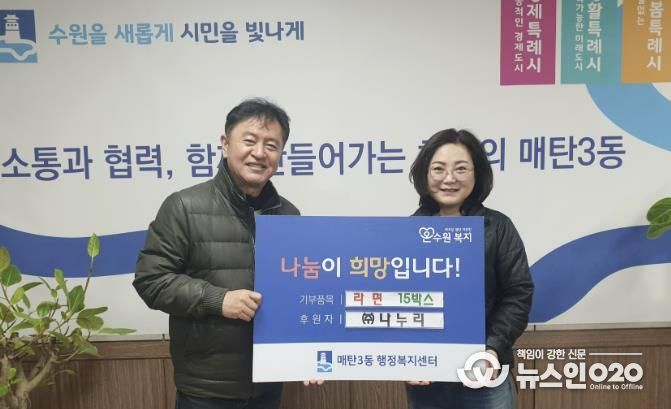 (뉴스인020 = 김성길 기자) 수원시 영통구 매탄3동 행정복지센터는 지난 6일, 관내 폐기물 수거업체인 ㈜나누리로부터 설 명절을 맞아 어려운 이웃을 위한 라면 15박스를 기탁받았다고 밝혔다.