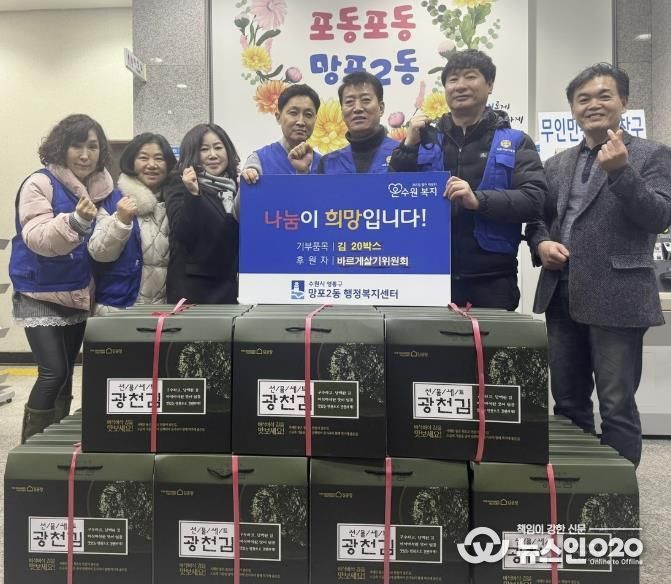 (뉴스인020 = 김성길 기자) 영통구 망포2동 행정복지센터는 지난 6일 망포2동 바르게살기위원회가 관내 저소득 가정을 지원하기 위해 김 20박스를 기탁했다고 밝혔다.