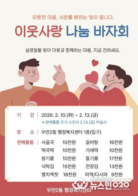 김진인 우만2동 지역사회보장협의체 민간위원장은 “새해를 맞아 지역주민들이 함께 따뜻한 마음을 나눌 수 있는 뜻깊은 자리가 될 것”이라며 “판매 수익금은 전액 관내 취약계층 지원 등 다양한 이웃사랑 실천 사업에 쓰일 예정이니, 많은 주민들의 관심과 참여를 부탁드린다”고 말했다.