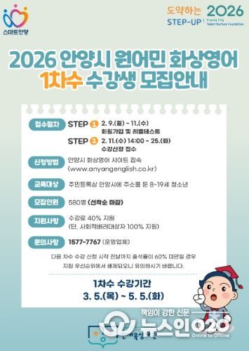(뉴스인020 = 김성길 기자) 안양시 인재육성재단은 관내 학생들의 외국어 의사소통 능력 향상과 글로벌 역량 강화를 위해 ‘2026 안양시 원어민 화상영어’ 사업을 지속 운영한다고 9일 밝혔다.
