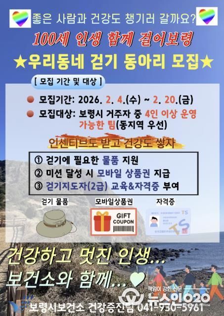 (뉴스인020 = 김성길 기자) 보령시는 주민의 신체활동 증진과 건강한 생활습관 형성을 위해 ‘우리동네 걷기동아리’ 참여 팀을 오는 20일까지 모집한다.