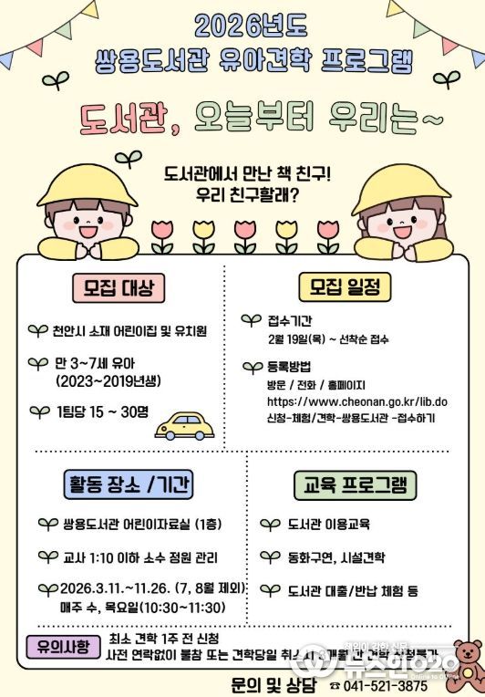 (뉴스인020 = 김성길 기자) 천안시 쌍용도서관은 내달부터 유아 견학프로그램 ‘도서관, 오늘부터 우리는’을 운영한다고 10일 밝혔다.