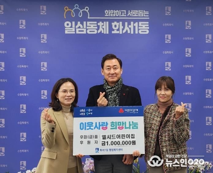 (뉴스인020 = 김성길 기자) 수원시 팔달구 화서1동은 지난 9일, 관내 엘시드어린이집이 지역 내 어려운 이웃을 돕기 위해 화서1동 행정복지센터에 현금 100만 원을 후원했다고 밝혔다.