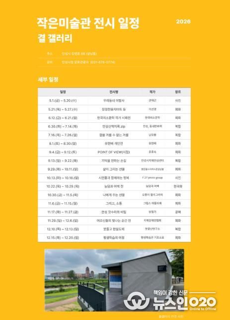 (뉴스인020 = 김성길 기자) 안성시는 2월 9일 ‘안성시 작은미술관(결갤러리, 시옷갤러리) 전시 공모’ 심사 결과를 발표하고, 총 31개의 전시를 최종 선정했다고 밝혔다.