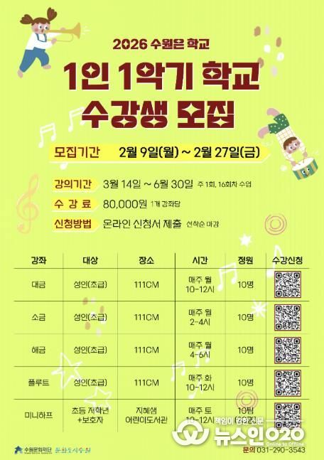 (뉴스인020 = 김성길 기자) 수원문화재단이 오는 27일까지 시민 누구나 참여할 수 있는 ‘2026 수원은학교 1인 1악기 학교’ 수강생을 선착순으로 모집한다.