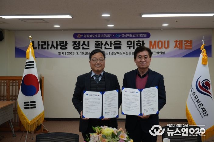 (뉴스인020 = 김성길 기자) 경상북도인재개발원(원장 우광진)과 (재)경상북도호국보훈재단(대표이사 한희원)은 2월 10일 오후 2시, (재)경상북도호국보훈재단 국민대표회의실에서 나라사랑 정신을 계승·확산하기 위한 업무협약(MOU)을 체결했다.