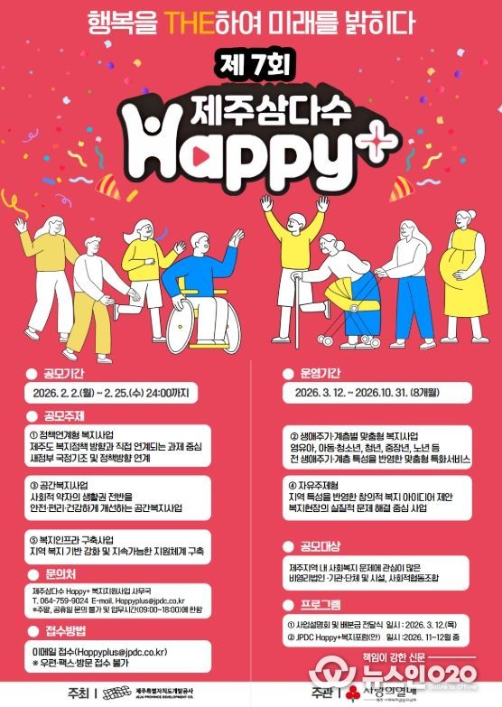 (뉴스인020 = 김성길 기자) 제주삼다수를 생산·유통하는 제주특별자치도개발공사(사장 백경훈)는 도내 복지 사각지대 해소를 위한 혁신적인 아이디어를 발굴하는 ‘제7회 제주삼다수 Happy+ 복지 지원사업’의 공모 접수가 오는 25일 마감된다고 밝히며, 도내 역량 있는 단체들의 적극적인 참여를 독려했다.