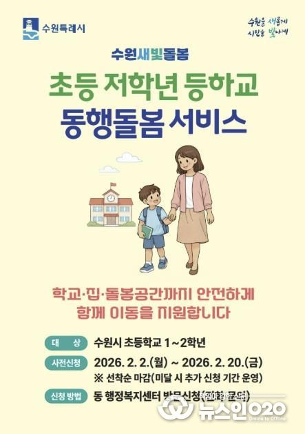 (뉴스인020 = 김성길 기자) 수원특례시가 ‘초등 저학년 등하교 동행돌봄서비스’ 사전 신청 기간을 운영한다.