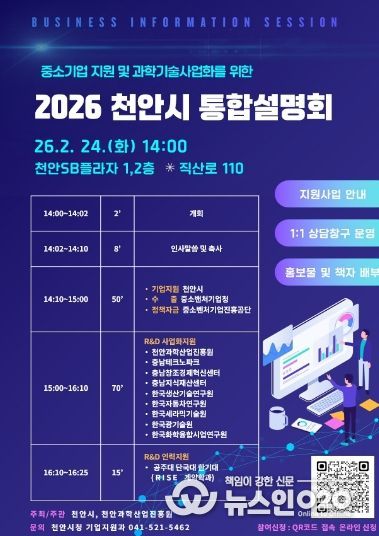 (뉴스인020 = 김성길 기자) 천안시는 오는 24일 천안과학산업진흥원과 함께 천안SB플라자에서 ‘중소기업 지원 및 과학기술사업화를 위한 2026 천안시 통합설명회’를 개최한다고 11일 밝혔다.