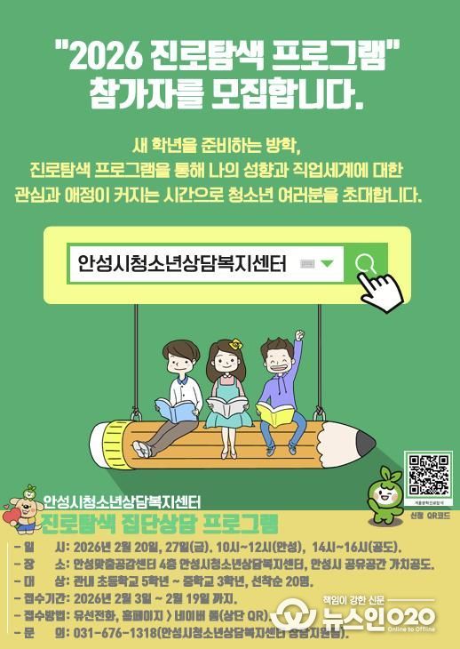 (뉴스인020 = 김성길 기자) 안성시청소년상담복지센터는 오는 2월 20일과 27일, 2일간 청소년을 대상으로 ‘겨울방학 프로그램 – 진로탐색’을 운영한다고 밝혔다.