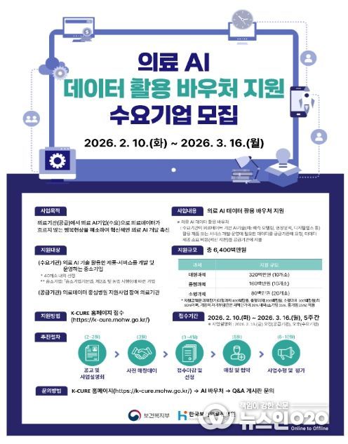 (뉴스인020 = 김나현 기자) 보건복지부와 한국보건의료정보원(원장 염민섭)은 안전한 의료데이터 활용 촉진을 위해 2월 10일부터 3월 16일까지'의료 AI 데이터 활용 바우처 지원사업'에 참여할 수요기업을 모집한다고 밝혔다.