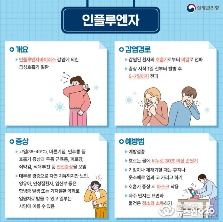 감염시 ▲중증화율이 높은 어르신, 임신부와 현재 인플루엔자 감염률이 높은 어린이, 청소년은 지금이라도 인플루엔자 백신을 접종하고 ▲손씻기, 기침예절, 환기와 같은 호흡기 감염병 예방수칙을 더욱 준수하고 ▲발열 및 호흡기 증상이 있을 때 출근을 자제하고 ▲여러 사람이 모이는 곳으로 외출은 삼가야 하며 ▲아프면 쉴 수 있도록 배려가 필요하다.