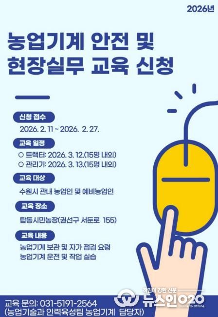(뉴스인020 = 김성길 기자) 수원특례시는 ‘2026년 농업기계 안전 및 현장실무 교육’ 수강생을 2월 27일까지 모집한다. 관내 (예비)농업인이 참여할 수 있다.