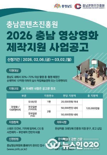 (뉴스인020 = 김성길 기자) 충남콘텐츠진흥원이 충남을 배경으로 한 독립예술영화 및 다큐멘터리를 대상으로 작품당 최대 5천만 원의 제작비를 지원하는 ‘충남 영상·영화 제작지원’ 사업을 추진한다고 밝혔다.