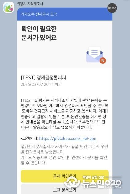 (뉴스인020 = 김성길 기자) 의왕시가 지적재조사 통지서를 스마트폰으로 발송하는 ‘모바일 전자고지 시스템’을 본격적으로 시행한다.