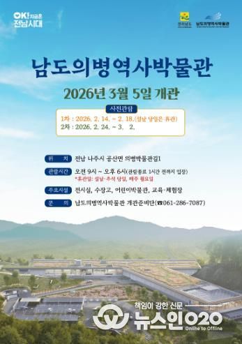 (뉴스인020 = 김성길 기자) 전라남도는 오는 3월 5일 개관하는 남도의병역사박물관을 설 연휴 등 두 차례 시범운영으로 사전 공개해 전시·시설 전반을 최종 점검하고 관람객 의견을 반영함으로써 ‘의(義) 교육 허브’로서의 완성도를 높일 계획이다.