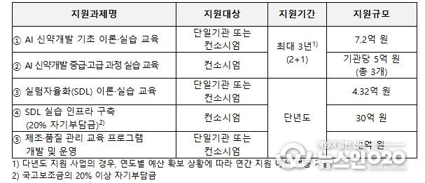 이번 공모를 통해 최대 7개 수행기관을 선정하며, 지원기간은 과제별로 구분하여 지원한다. 지원과제는 AI 신약개발 기초 이론·실습 교육, 중급·고급 과정 실습 교육, 실험자율화 이론·실습 교육, 실험자율화 실습 인프라 구축, 제조·품질 관리 교육까지 총 5개 단위이다.