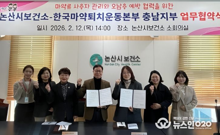 (뉴스인020 = 김성길 기자) 논산시는 12일 논산시보건소 소회의실에서 한국마약퇴치운동본부 충남지부와 ‘마약류 오남용 예방 및 마약류 사용자·고위험군 연계 관리를 위한 업무협약(MOU)’을 체결했다.