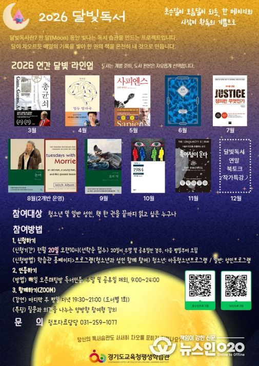 (뉴스인020 = 김성길 기자) 경기도교육청평생학습관(관장 류영신)이 청소년과 성인이 함께 참여하는 독서 프로그램 ‘달빛독서’를 운영한다.