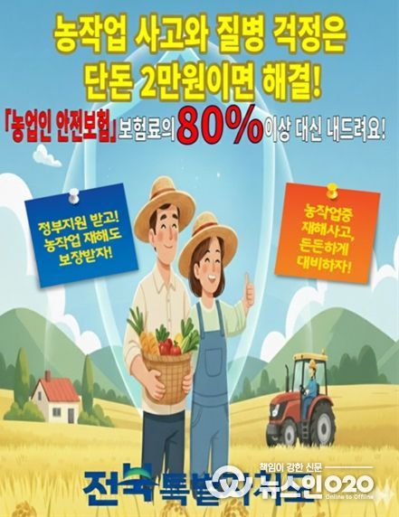 (뉴스인020 = 김성길 기자) 전북특별자치도는 농업인의 안전사고 예방과 생활 안정을 위해 보험료의 80% 이상을 지원하는 ‘농업인 안전보험’ 가입 확대에 나섰다.