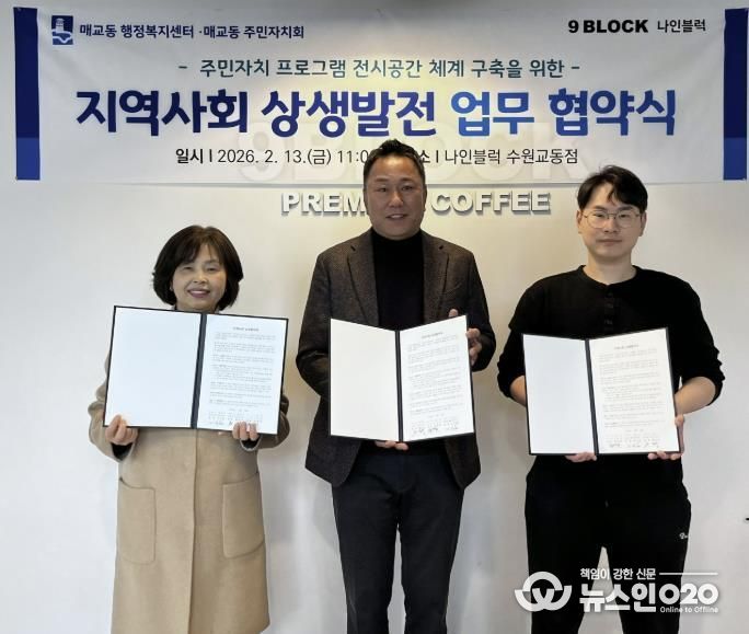 (뉴스인020 = 김성길 기자) 수원시 팔달구 매교동 주민자치회는 지난 13일, 주민자치 프로그램 작품전시회 운영을 위한 전시공간 체계 구축 및 지역사회 상생발전을 목적으로 나인블럭 수원교동점과 업무협약(MOU)을 체결했다.