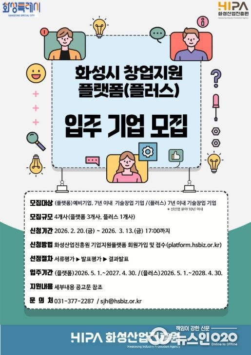 (뉴스인020 = 김성길 기자) 화성산업진흥원(원장 전병선)은 동탄2 인큐베이팅센터 내 창업보육센터 ‘창업지원플랫폼’과‘창업지원플랫폼 플러스’ 입주기업을 오는 3월 13일까지 모집한다고 밝혔다.