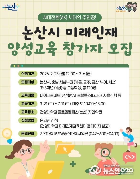 (뉴스인020 = 김성길 기자) 논산시가 2월 23일부터 3월 6일까지 ‘2026년 논산시 미래인재 양성교육’프로그램에 참여할 학생들을 모집한다.