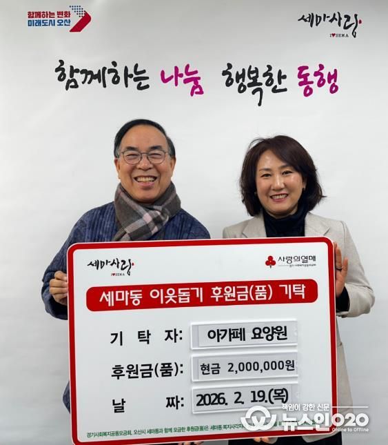 (뉴스인020 = 김성길 기자) 오산시 세마동 행정복지센터는 지난 19일 오산시 외삼미동에 소재한 아가페 요양원으로부터 지역 내 취약계층 지원을 위한 성금 200만 원을 기탁받았다고 밝혔다.