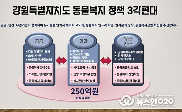 (뉴스인020 = 김성길 기자) 강원특별자치도는 2월 20일 오후 2시 강릉에 위치한 도 반려동물지원센터에서 ‘강원형 동물복지 정책’을 발표하고, 복지‧의료‧산업‧관광을 아우르는 4대 전략을 본격 추진한다고 밝혔다.