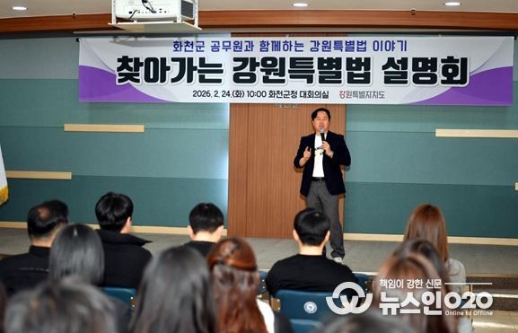 (뉴스인020 = 김성길 기자) 강원특별자치도는 2월 24일 화천군청 4층 대회의실에서 화천군 공무원을 대상으로 ‘찾아가는 강원특별법 설명회’를 개최했다.