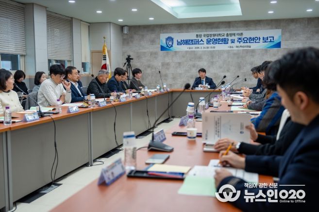 (뉴스인020 = 김성길 기자) 경남도립남해대학(총장 노영식)은 24일 혁신학습지원실에서 국립창원대학교 통합 출범에 따른 남해캠퍼스 운영 현황 및 주요 현안 보고회를 개최했다.