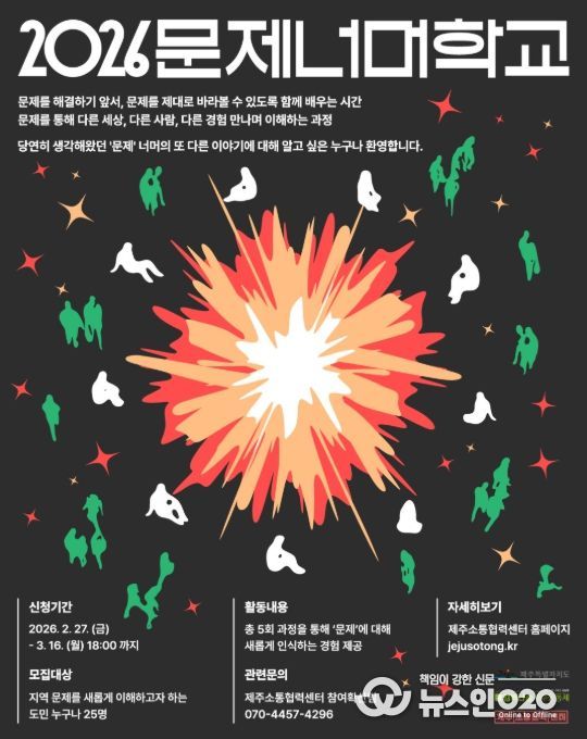 (뉴스인020 = 김성길 기자) 제주특별자치도와 제주특별자치도 소통협력센터가 도민 주도의 지역문제 탐구를 지원하는 교육 프로그램 ‘2026 문제너머학교’를 운영하고, 27일부터 3월 16일까지 참여자를 선착순으로 모집한다.