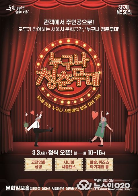 (뉴스인020 = 김성길 기자) 서울시는 어르신들이 편하고 즐겁게 머물 수 있는 문화쉼터 ‘누구나 청춘무대’를 3일부터 정식 운영한다고 밝혔다. ‘누구나 청춘무대’는 55세 이상 어르신이면 누구나 무료로 공연과 영화를 관람하고 다양한 체험 프로그램에 참여할 수 있는 열린 문화공간이다.