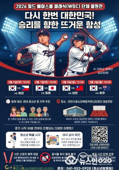 (뉴스인020 = 김성길 기자) (재)천안시청소년재단 산하 천안시청소년복합커뮤니티센터가 ‘2026 월드 베이스볼 클래식(WBC)’ 대한민국 경기 일정에 맞춰 단체 응원전을 운영한다.