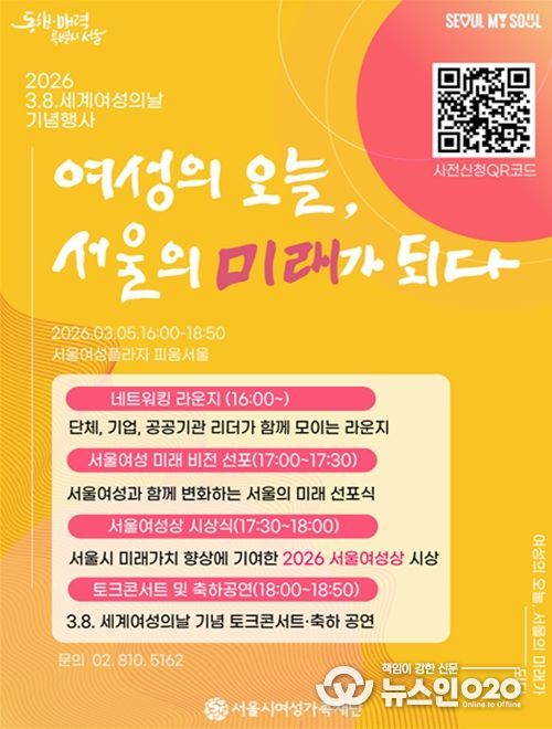 (뉴스인020 = 김성길 기자) 서울시여성가족재단이 3월 8일 세계여성의 날을 기념하여 여성 리더십의 가치를 공적으로 인정하고 민관 협력을 다지는 ‘2026 3.8 세계여성의 날 기념행사’를 개최한다.