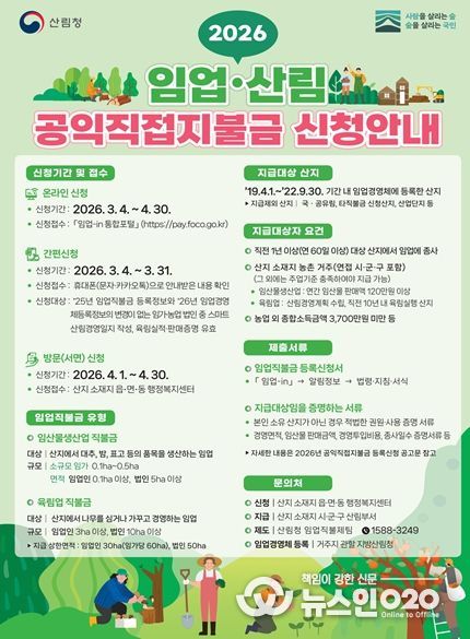 (뉴스인020 = 김성길 기자) 강원특별자치도는 2026년 임업·산림 공익직접지불금 신청을 3월 4일부터 4월 30일까지 접수한다고 밝혔다.