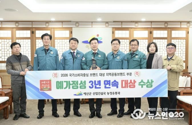 (뉴스인020 = 김성길 기자) 예산군 농특산물 공동브랜드 ‘예가정성’이 브랜드 인지도와 선호도 측면에서 소비자에게 높은 평가를 받아 3년 연속 ‘2026 국가 소비자중심 브랜드(지역공동브랜드 부문) 대상’을 수상했다.
